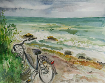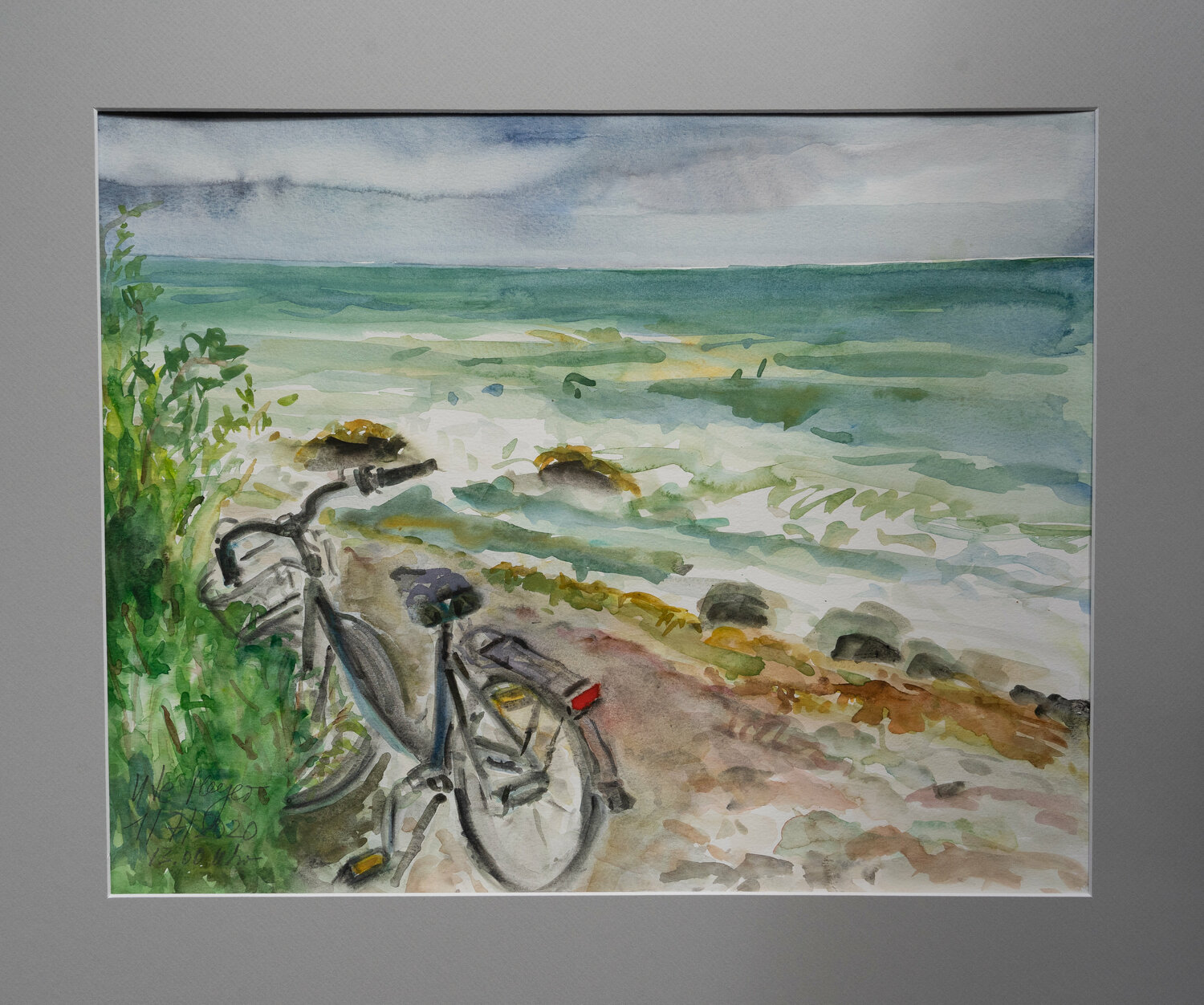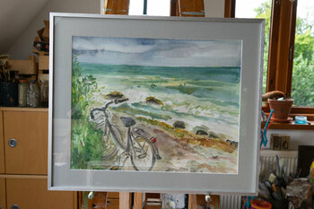 Das Bild ist am Strand entstanden. Ich fuhr mit dem Fahrrad an diesen Ort. Der Weg endete am Strand. Ein kräftiger Wind und schnell ziehende Wolken versprühten eine lebendige Atmosphäre. Das Aquarell ist auf einem hellgrauen Passepartout aufgezogen und mit einem matten Alurahmen der Firma Nielsen gerahmt, mit den Maßen 50x60 cm. Meine Signatur befindet sich auf der Vorderseite.