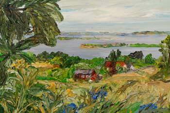 Dieses Bild ist im Frühsommer an einem wolkenverhangenen, warmen Tag auf der dänischen Insel Ærø entstanden. Ich konnte meine Malausrüstung auf einem Picknicktisch ausbreiten und den weiten Blick über die Insel malen, der mich immer wieder fasziniert. Expressiv und dynamisch trug ich sehr pastos die Ölfarben mit dem Paletten Messer auf, um den kraftvollen Ausdruck der Landschaft einzufangen. Das Bild bringt Weite und Energie in einen Raum.
