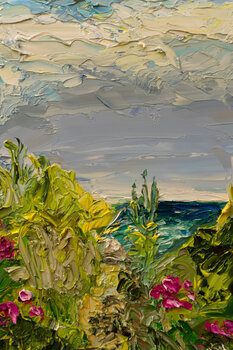 An einem windigen, sonnigen Nachmittag entstand dieses Ölbild auf dem Weg zum Strand auf der dänischen Ostseeinsel Ærø. Um die intensiven Farben der Heckenrosen und die kraftvolle Energie von Wind, Sonne, Pflanzen und Himmel einzufangen, habe ich die Ölfarben pastos mit einem Palettenmesser aufgetragen. Das Bild bringt den Sommer in jeden Raum. Meine Signatur befindet sich auf der Vorderseite, und ein Stahlseil ermöglicht eine sichere Aufhängung.… Die Kanten sind weiß, sodass das Bild auch ohne Rahmen aufgehängt werden kann.