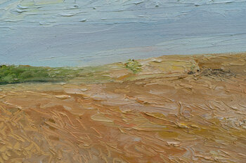 Dieses Bild habe ich an einem an einem sonnigen, warmen Tag im Juli direkt an der Küste gemalt. Unter einem hellen blauen Himmel mit leichten weißen Schleierwolken leuchtet ein Getreidefeld in Goldocker. Ein Weg führt zu einer Anhöhe. Links im Bild strahlt das tiefe Blau der Ostsee. Ein kleines Stück von einer Bucht und eine mit hellen Steinen gesäumter Strand ist zu sehen. Im Vordergrund liegen Feldsteine im grünen Gras. Die Ölfarbe ist gespachtelt… und der pastose Farbauftrag verleiht dem Bild Dynamik und Plastizität. Der Bildträger ist eine selbstbespannte und dreifach grundierte Leinwand, die mit einem Stahlseil als Aufhängung versehen ist. Die Ränder sind bemalt. Das Bild kann ohne Rahmung aufgehängt werden. Meine Signatur steht auf der Vorderseite.