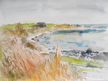 Dieses Bild entstand im März an einem grauen wolkenverhangenen Tag an der dänischen Ostsee. Die hohe Luftfeuchtigkeit begünstigte die weichen Farbübergänge beim Aquarellieren .Im Vordergrund stehen rötlich ockerfarbene Gräser. Der Blick geht in die Bucht mit seinem blaugrauen Wasser. Der steinige Strand führt entlang der Bucht bis zur Spitze. In der Ferne ist eine braune Holzhütte zu sehen. Hinter dieser liegt ein grünes Feld. 300gr Bütten von Centenaire… diente als Malgrund. Das Bild ist auf einem grauen Passepartout Karton von der Größe 60x80 cm fixiert.