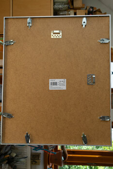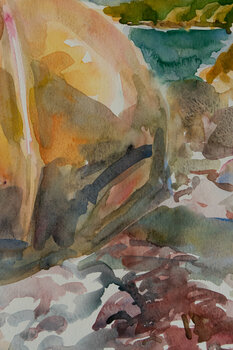 Das Aquarell entstand an der Küste der dänischen Insel Aeroe im Sommer. Der in der Sonne leuchtende Stein interessierte die Malerin. Sie setzte sich direkt davor zu ihrer Linken die Ostsee mit den anrollenden Wellen. Das Aquarell ist auf einem hellgrauen Passepartout aufgezogen und mit einem matten Alurahmen der Firma Nielsen gerahmt, mit den Ma
