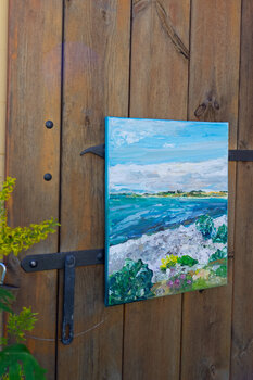 Dieses Bild ist an einem windigen Tag an der Küste der dänischen Ostsee Insel Ærø entstanden. Meine Staffelei stand im Windschatten des Autos und ich habe die Stimmung mit den ziehenden Wolken und dem bewegten Meer mit Ölfarbe und Spachtelmesser eingefangen. Im Vordergrund sind die rotvioletten Blüten der Strandnelken und das leuchtende Gelb des Meerkohls zu sehen. Die Kanten der Leinwand sind bemalt, ein Stahlseil sorgt für eine sichere Aufhängung.… Meine Signatur befindet sich auf der Vorderseite.