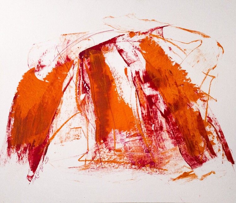 Wut oder Lebensfreude. Diagonale und sich überlagernde Striche lassen eine Bewegung erkennen, fast wie ein Sturm oder eine tänzerische Geste. In Bezug auf Sturm und Bewegung wirkt das Werk wie ein eingefrorener Moment inmitten eines tosenden Geschehens. Die geschwungenen Linien und verwischten… Flächen erinnern an heftige Windböen, die alles durcheinander wirbeln. Orangefarbene Flächen, vom Künstler Fetzen genannt, scheinen von einer unsichtbaren Kraft durch den Raum gezogen zu werden. Das Ganze wirkt, als würde etwas auseinanderbrechen oder zerreißen. Trotz der chaotischen Erscheinung gibt es eine Art inneren Rhythmus. Diese Bildsprache erzeugt ein Gefühl der Unruhe und gleichzeitig eine faszinierende Dynamik. Sie lässt viele Interpretationen zu.