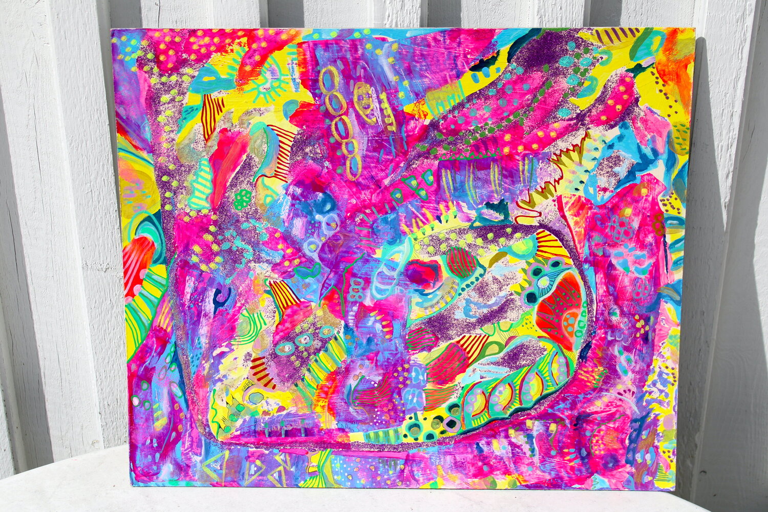 In diesem temperamentvollen Stück habe ich die Lebendigkeit des Lebens mit lebhaften Acryl- und Aquarellfarben sowie einem Hauch von Sprühfarbe eingefangen. Abstrakte Gedanken flossen frei, während ich Farben und Formen übereinanderschichtete und einen energetischen Tanz auf der Leinwand schuf. Emotionen nahmen Gestalt an in Form von rosafarbenen Spritzern, gelben Wirbeln und Punkten, die vor einem dynamischen Hintergrund spielen und den Betrachter… zu einem Fest des Ausdrucks und der Fantasie einladen. Jeder Strich fängt einen Moment ein und verspricht, jeden Raum mit dem Puls der Kreativität zu erfüllen.