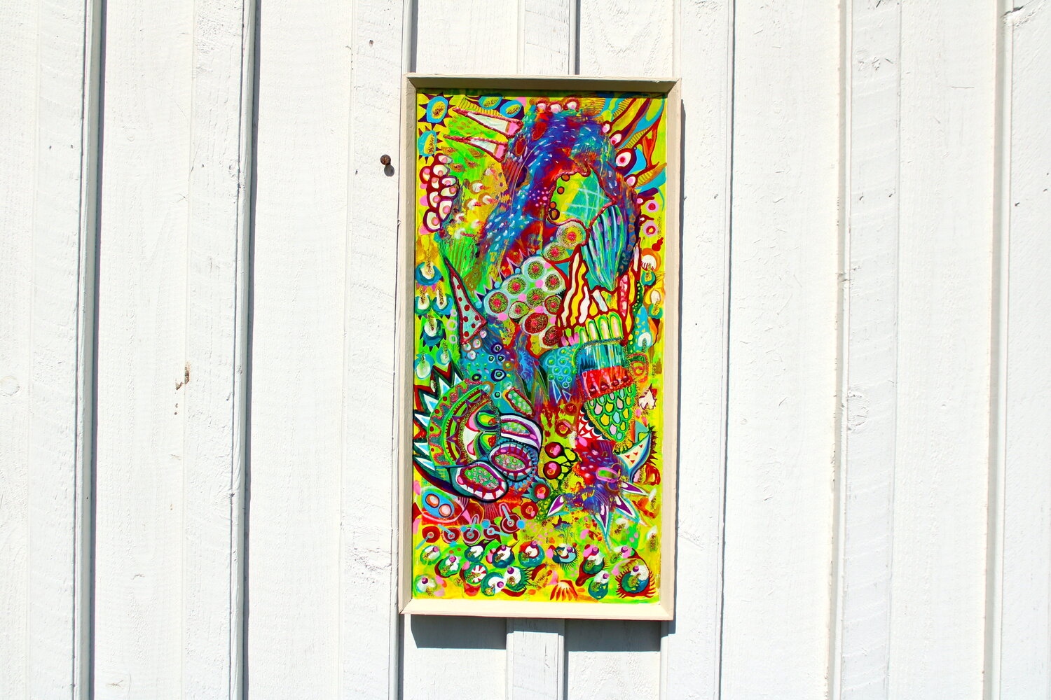 Werk auf synthetischer Platte. Kunstwerk gerahmt.