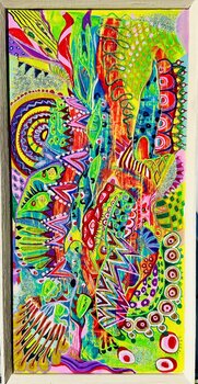 Ich habe meine Seele in diesen lebhaften Wandteppich aus Farbtönen gesteckt, der Acryl-, Aquarell- und Gouachefarben sowie einen Hauch Sprühfarbe umfasst. Es ist ein Tanz metaphysischer Ideen, abstrakter Formen und Anklänge orientalischer Kunstfertigkeit. Jeder Strich ist ein Herzschlag, ein Energieschub, der mit seinem pulsierenden Puls jeden Raum zu beleben verspricht. Die Verschmelzung von Farben und Mustern bietet einen Einblick in eine Welt,… in der Emotionen und Gedanken in einem harmonischen Kaleidoskop wirbeln.