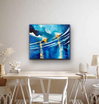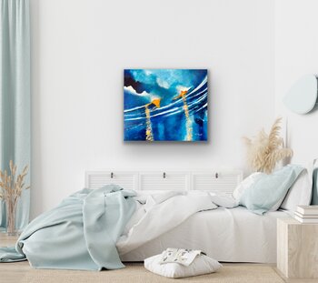 Eine Darstellung der Bewegung durch Sonne und Meer, die in die Zukunft schwankt. In dieser Arbeit habe ich mit der Verwendung von nur drei Farben experimentiert und mit verschiedenen Blautönen gespielt.