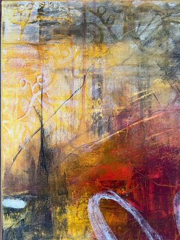 Immer wieder wiederholen sich in diesem vielschichtigen Werk Formen und Figuren,von denen ich mir Schablonen erstellt habe. Was auffällt ist, dass diese jedoch nie dominant in Scene gesetzt sind sondern das Gesamtwerk lediglich unterstützen. ich trage intuitiv Farbe auf, Schicht um Schicht, bis sie instinktiv zu einem gewünschten Ergebnis kommt. dadurch bau ich das Bild in vielen Schichten auf und will, dass jedes Gemälde eine Geschichte erzählt… und so fügt jede Farbschicht ein neues Kapitel hinzu und lädt zu einem Dialog mit der vorherigen ein. Der kreative Prozess ist ein Gleichgewicht zwischen intuitivem Spuren auf der Leinwand und sorgfältiger Überlegung. Inspiriert werde ich von den Strukturen und Geschichten die uns allen täglich begegnen.