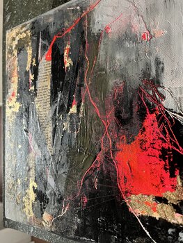 Das abstrakte Mixed-Media-Gemälde fasziniert mit leuchtendem Pink, tiefem Schwarz und reinem Weiß. In der Mitte dominieren Collageelemente: vergilbte Buchseiten in altertümlicher Sütterlinschrift und Fragmente eines Gellydrucks in kühlen Schwarz- und Grautönen. Diese Elemente sind kunstvoll miteinander verwoben, wobei Blattgold subtil in die Collage eingearbeitet ist und dem Werk einen Hauch von Opulenz verleiht. Die Buchseiten erzählen Geschichten… vergangener Zeiten, während der Gellydruck modernen Ausdruck vermittelt. Die Farben und Texturen verschmelzen zu einem fesselnden Kontrast, der die Betrachter in eine vielschichtige Welt von Vergangenheit und Gegenwart entführt. Das Spiel zwischen Tradition und Moderne, gepaart mit dem Glanz des Blattgolds, verleiht dem Kunstwerk eine einzigartige Aura und regt die Fantasie des Betrachters an.