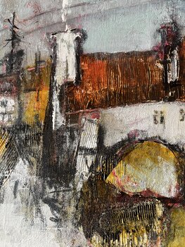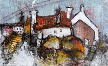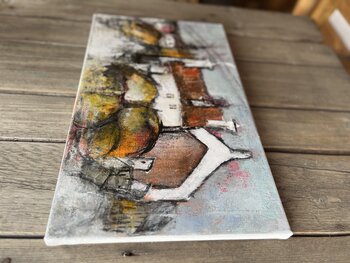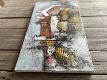 In meiner Schöpfung lässt sich das Wechselspiel von Energie und Melancholie erkennen, die sich durch die expressive Mischung von Acryl, Ölpastell und Gips offenbart. Die semi-abstrakte Darstellung eines kleinen Dorfes fängt die Essenz verlorener Geschichten ein und lädt den Betrachter ein, die Tiefen seiner gefühlten Landstriche zu erforschen. Jeder Strich und jede Farbwahl sind gedacht, um Bewegung und emotionale Tiefe in die Häuser und Landschaften… zu bringen, die so viel mehr als nur Orte