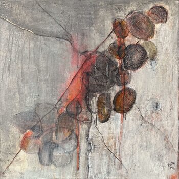 In diesem 40 x 40 cm großen Kunstwerk ziehen sich von unten links nach oben rechts runde Formen, die an Kieselsteine erinnern, in wundervollen, changierenden Farben über die Leinwand. Das Spiel der Farben von Cremetönen bis zu Schlammgrau wird von Linien durchzogen, die wie Risse im Mauerwerk wirken und dem Gemälde eine faszinierende Textur verleihen.