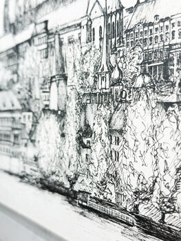 Dieses Kunstwerk ist eine meiner allerersten Pleinair-Zeichnungen, entstanden während meines Architekturstudiums aus dem tiefen Wunsch heraus, die stille Kraft architektonischer Schönheit mit der Hand einzufangen. Stundenlang saß ich am Ufer der Moldau, völlig versunken in den Ausblick, die Menschen um mich herum ausblendend und mich nur auf den Rhythmus der sich in Linien entfaltenden Stadt konzentrierend.