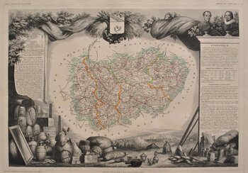 INFORMATION: Prächtiger Kupferstich aus der Zeit, gedruckt 1846 im Atelier Combette in Paris. Die Abbildungen der Orte und Traditionen des Departements rund um die Karte stammen vom Maler Raymond Bonheur, dem Vater der Malerin und Bildhauerin… Rosa Bonheur.