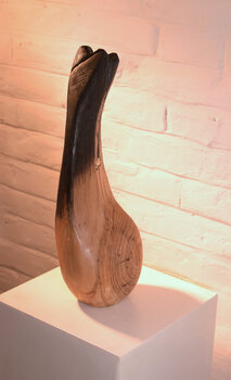 Es ist ein Dialog zwischen zwei Körpern - dem des Menschen und dem des Baumes. Es beginnt schon bei der Auswahl des Holzes - ich nehme nur Holz, das von einem verstorbenen Baum kommt (nicht einer, der aus rein wirtschaftlichen Gründen gefällt wurde). So wird bereits die natürliche Geschichte von Leben und Sterben aufgegriffen. Ich beginne erst zu arbeiten, wenn ich eine Beziehung zu dem Teil des Baumes entwickelt habe, den ich bearbeiten möchte.… Dabei vereint sich mein handwerkliches Können mit einem elaborierten Wissen über das Material. Ich betrachte den Arbeitsprozess als einen Dialog in welchem ein Schriftstück das Ergebnis ist. Dabei greife ich die Tradition der Kalligrafie auf und schreibe mit Feuer und Asche. Große Risse werden mit Metall stabilisiert - wie die menschliche Haut bei einem Riss, einer Verletzung ein Schmetterlingspflaster bekommt. Anschließend wird die Oberfläche mit Schellack, einem natürlichen Produkt, überzogen. Diese Eiche lebte in Niederösterreich.