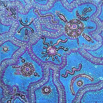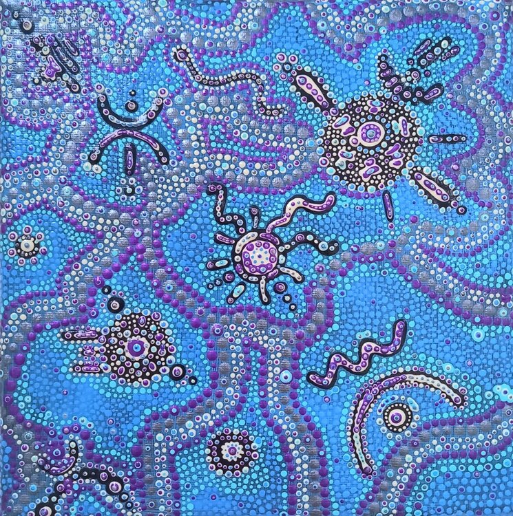 In diesem Werk wollte ich die lebendige Energie der Unterwasserwelt durch abstrakte Motive der Aborigines einfangen. Jeder Punkt ist ein Pulsschlag, ein Atemzug aus dem unendlichen Ozean, vibrierend im Rhythmus der Hoffnung und Verbundenheit. Dieses Acrylgemälde lädt Sie ein, in ein Universum einzutauchen, in dem Ruhe und Mystik sich vereinen und jeden Raum mit einer wohltuenden und kraftvollen Aura erfüllen.