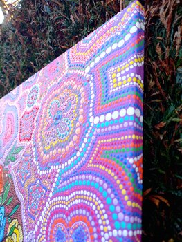 In diesem Kunstwerk wollte ich die lebendige Energie und Tiefe einer leidenschaftlichen Seele einfangen. Geometrische Formen und traditionelle Punktemuster der Aborigines verschmelzen zu einem farbenfrohen Tanz voller Energie und Leben. Jede leuchtende Farbe drückt innere Schönheit und Widerstandskraft aus und bringt ein warmes, inspirierendes Licht in Ihre Räume. Dieses Gemälde ist eine Hommage an die Vielfalt und die universellen Gefühle.