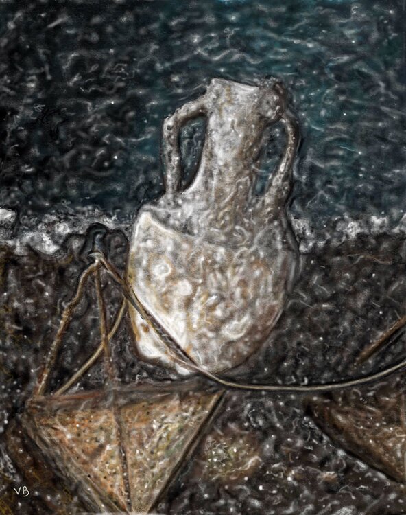 Dieses digitale Werk stellt eine Reise zwischen dem Realen und dem Surrealen dar, bei der eine einfache Amphore aus einer rauen See auftaucht, bedeckt und aufgehängt von Netzen, fast wie eine Metapher für das Leben, das sich in seiner Komplexität verflechtet. Die Verwendung surrealistischer und metaphysischer Elemente verstärkt das Mysterium und die emotionale Tiefe und ruft Reflexionen über Widerstandsfähigkeit und Beständigkeit inmitten der Wellen… des Wandels hervor. Dieses Stück bringt im Zuhause derjenigen, die es auswählen, eine ruhige und zugleich tiefgründige, nachdenkliche Energie, regt Gespräche an und gibt Einblick in die verborgene Bedeutung hinter dem Offensichtlichen.