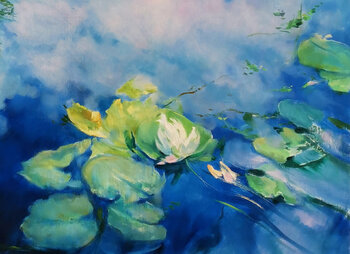 Teich mit Seerosen. Zeitgenössische impressionistische Malerei, inspiriert von Claude Monets Meisterwerken. Fliegende Wolken über dem morgendlichen Teich, Reflexionen auf dem Wasser, ruhige Schönheit des Ortes, Harmonie in Bewegungen und Rhythmen der Natur. Großes Ölgemälde auf Leinwand mit reichhaltiger Textur und Farbpalette. Schattierungen von Grün, Ultramarin, Blau, Lila und Kadmium bilden die Hauptfarbkomposition der Arbeit. Die Malerei wurde… alla prima mit Pinsel- und Spachtelarbeiten erstellt. Kunstwerk ist eine auf Holzgrund gespannte Leinenleinwand, hat keinen Rahmen, signiert vom Künstler auf der Vorderseite.