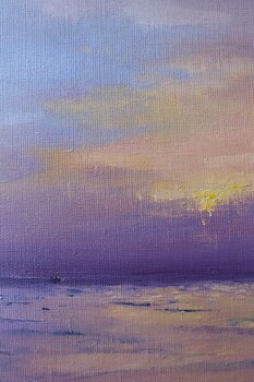 Das sanfte Zusammenspiel von Lila-, Rosa- und Goldtönen auf diesem Gemälde lädt zu Ruhe und Besinnung ein und vermittelt eine friedvolle Energie, die jeden Raum in eine Oase der Ruhe und Wärme verwandelt.