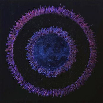 Mit der Kraft der Kettensäge habe ich die Ringformen tief in die Plexiglasplatte eingesägt und diese im Anschluss mit verschiedenen… Pigmenten, die je nach Licht und Betrachtungswinkel die Farbigkeit verändern, gefasst. Diese alles zusammen erzeugt eine tiefe, fast meditative Atmosphäre. Dieses Bildwerk erfreut sich an Geheimnisvollem und Unbekanntem und bringt eindrucksvoll Ruhe und gleichzeitig eine dynamische Lebendigkeit in einen Raum.