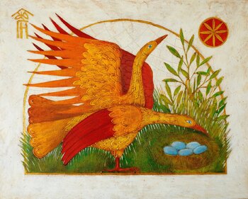 Das Gemälde ist im Stil der Volkskunst gehalten und zeigt zwei leuchtende Vögel, die familiäre Bindungen, Fürsorge und Fortpflanzung symbolisieren. Ihre warmen Farbtöne – Gold, Orange und Burgunderrot – vermitteln ein Gefühl von Wärme, Schutz und Harmonie. Einer der Vögel steht vor dem Nest… und bewacht liebevoll das Gelege, das die neue Generation symbolisiert. Der zweite Vogel breitet seine Flügel aus, als wolle er die Familie vor äußeren Bedrohungen schützen, und verleiht dem Bild Dynamik und Tiefe.