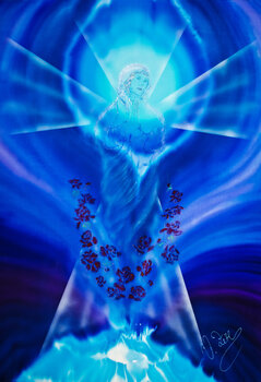 In diesem Werk habe ich die zarte Verschmelzung von Realität und Traum eingefangen, inspiriert von spiritueller Reinheit und innerem Licht. Die leuchtenden Blautöne und feinen Rosen symbolisieren Hoffnung und Schutz. Ich wollte, dass das Bild eine beruhigende, energetische Präsenz ausstrahlt, die Ihrem Raum Frieden und eine mystische Harmonie verleiht.
