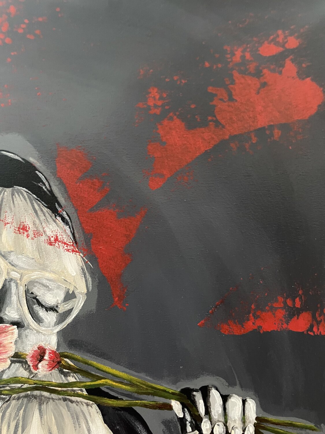 Mit diesem Bild wollte ich die komplexe Beziehung zwischen inneren Gefühlen und der äußeren Welt festhalten. Es ist mein Versuch, Momente der Einkehr und des stillen Schmerzes darzustellen, in denen Schönheit zugleich anzieht und verzehren kann. Die roten Akzente symbolisieren für mich die emotionale Intensität und den unsichtbaren inneren Aufruhr, der zum Nachdenken über Verletzlichkeit einlädt.