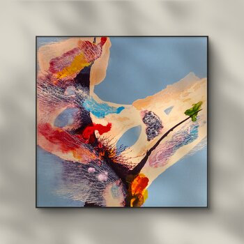 Dieses Gemälde ergänzt die Essenz von „Primordial Bloom“ und dient als Gegenstück, das das lebendige Zusammenspiel von Wachstum, Energie und den Zyklen der Natur erforscht. Es zeigt eine abstrakte Komposition mit einem hellblauen Hintergrund, der einen offenen Himmel oder unendlichen Raum als Kulisse für dynamische Bewegung heraufbeschwört. Organische Formen, leuchtende Rot-, Gelb- und Grüntöne sowie sanfte Weißtöne und reiche Texturen erzeugen ein… Gefühl von Harmonie und Erneuerung.