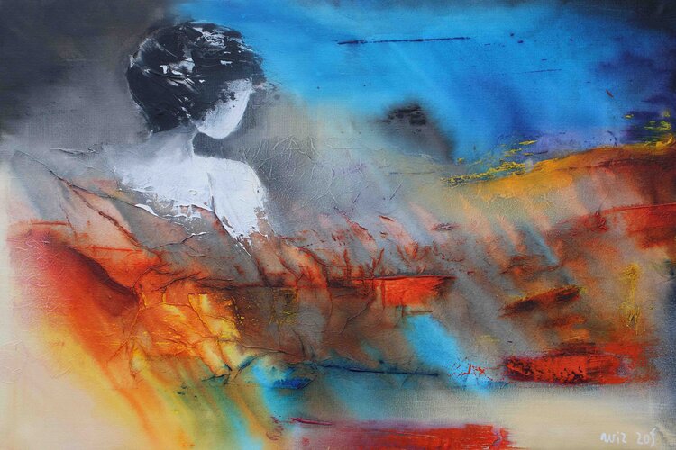 In diesem ausdrucksstarken Acrylbild habe ich mit kräftigen Strichen und einer lebhaften Farbpalette, die einen Moment der Introspektion einfängt, unverfälschte Emotionen hervorgerufen. Der Kontrast zwischen der feurigen Wärme an der Basis und den kühlen, ruhigen Blautönen darüber verkörpert eine persönliche Reise von Aufruhr zu Ruhe. Es ist eine Erzählung der Transformation, die tief nachhallen und einen Energieschub und Kontemplation in jeden Raum… bringen soll, den sie schmückt.
