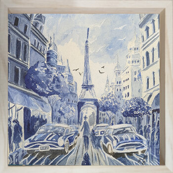 Ich wollte eine Atmosphäre, ein Lichtspiel und ein Gefühl von Bewegung einfangen. Ich erzähle keine konkrete Geschichte, sondern eine Szene aus einem in der Zeit schwebenden Leben und dem Mythos eines ewigen Paris, zugleich schick, lebendig und romantisch. Die einsame… Silhouette, die sich entfernt, vermittelt ein Gefühl des Reisens, der Einsamkeit inmitten der Menge, eines besinnlichen Spaziergangs. Ich lade Sie ein, sich in den Straßen der Hauptstadt zu verlieren. Ich drücke vor allem ein Gefühl von Nostalgie und Träumerei aus. Die Wahl des monochromen Blaus hebt die Szene vom reinen Realismus ab und taucht sie in eine poetische, ja melancholische Atmosphäre. Ich beschwöre ein emotionales Paris, eine idealisierte Erinnerung oder einen Traum herauf. Die Energie der Stadt wird durch die Farbpalette gemildert und schafft eine friedliche und besinnliche Atmosphäre.