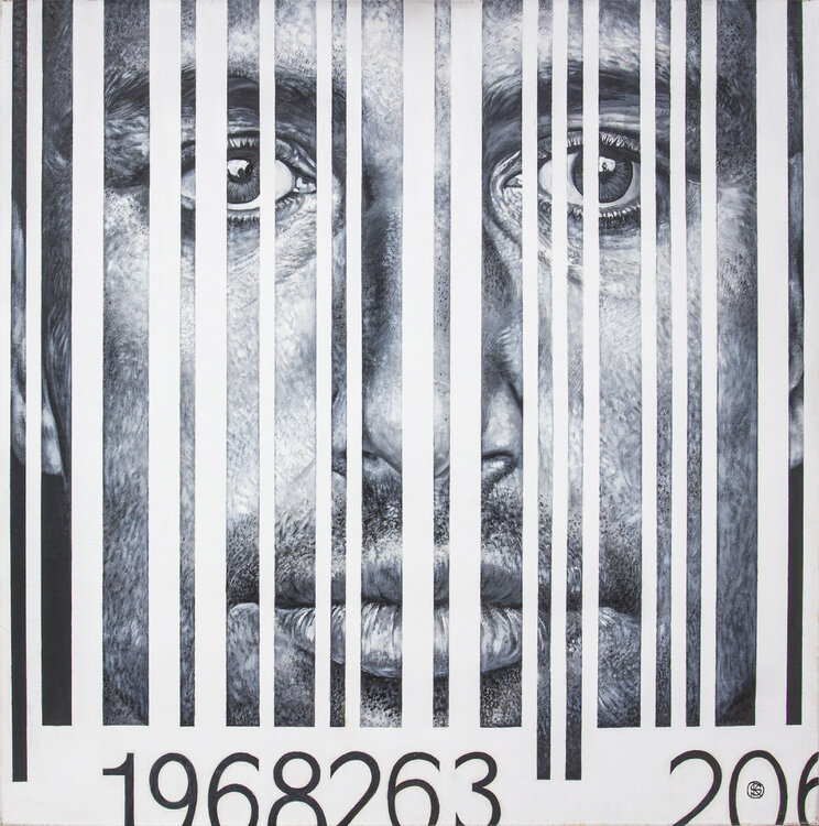 Das Gemälde „Totale Kontrolle“ zeigt einen Menschen, der zum Symbol des Systems mutiert. Ein Männergesicht löst sich in der Struktur eines Barcodes auf: Die schwarzen Linien formen das Bild und löschen gleichzeitig die Individualität aus, die weißen Zwischenräume bilden ein Gitter, das an einen Käfig erinnert. Hier wird Identifizierung zu einer Form der Entpersonalisierung – der Mensch existiert nicht mehr als Persönlichkeit, sondern als Objekt,… das gescannt werden kann. Das Werk spiegelt eine Welt wider, in der Kontrolle nicht mehr als Gewalt erscheint, sondern in Technologie, Wirtschaft und Alltag eingebettet ist. In einem Raum totaler Transparenz verschwindet die Freiheit nicht durch Verbote, sondern dadurch, dass alles registriert und berechnet werden kann.