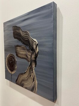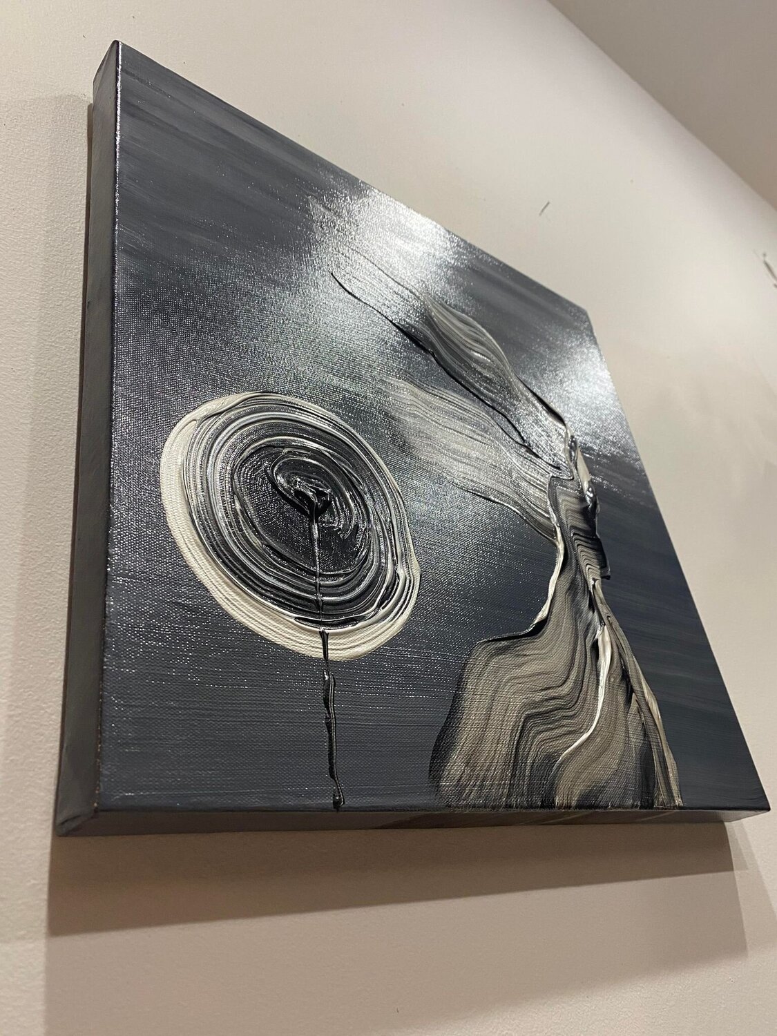 Offenbarung ist eines der beliebtesten Gemälde von Yiannis Kaminis, was seinen Preis erklärt. In diesem Meisterwerk aus silbernen und schwarzen Acrylfarben auf Leinwand in Manhattan, New York, entdeckte der Künstler eine Offenbarung. Es ist der Moment, in dem wir verstehen, dass wir zwar leben, aber sterblich sind. Es ist die Dualität unserer Natur zu akzeptieren, dass wir geboren wurden, um schließlich auf dieser Existenzebene zu sterben. Das Gemälde… hat viele Lesarten. Man kann eine Dame sehen, die mit dem Rücken zum Wind steht. Eine andere Lesart ist das Profil von Haros (dem Gott der mythologischen Unterwelt).