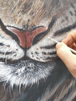 Die rohe, edle Leinwand aus natürlichem Leinen verleiht dieser schwebenden Szene eine lebendige Textur. Der Blick des Tigers, kraftvoll und ruhig zugleich, scheint die… Oberfläche zu durchdringen – eine stille Einladung, sich dem Tier oder vielleicht sich selbst zu stellen.