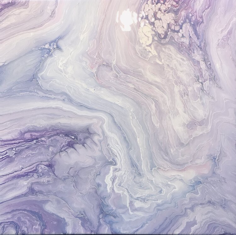 The delicate shades of purple, blue and pink blend harmoniously, creating a marbled effect reminiscent of clouds colored by the setting… sun. Streaks of pure white cross the composition like rays of light cutting through the evening sky, adding depth and movement to the painting.