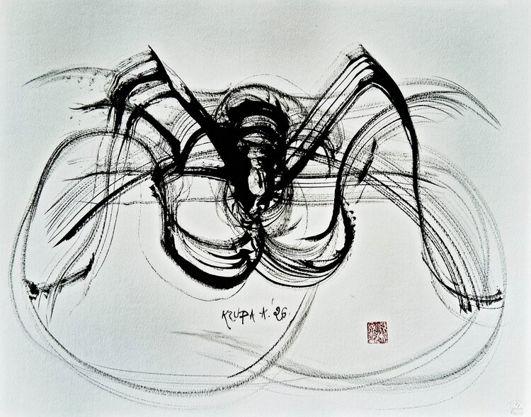 This artwork presents a dynamic, gestural ink composition rendered in bold black strokes on a white ground. The central form appears almost insect-like or arachnid, with a dense, dark core from which elongated, arching limbs or appendages extend outward symmetrically. These limbs are not rigid; instead, they dissolve into sweeping, fluid lines that loop and trail across the surface, suggesting motion, vibration, or energy radiating from the center.…
