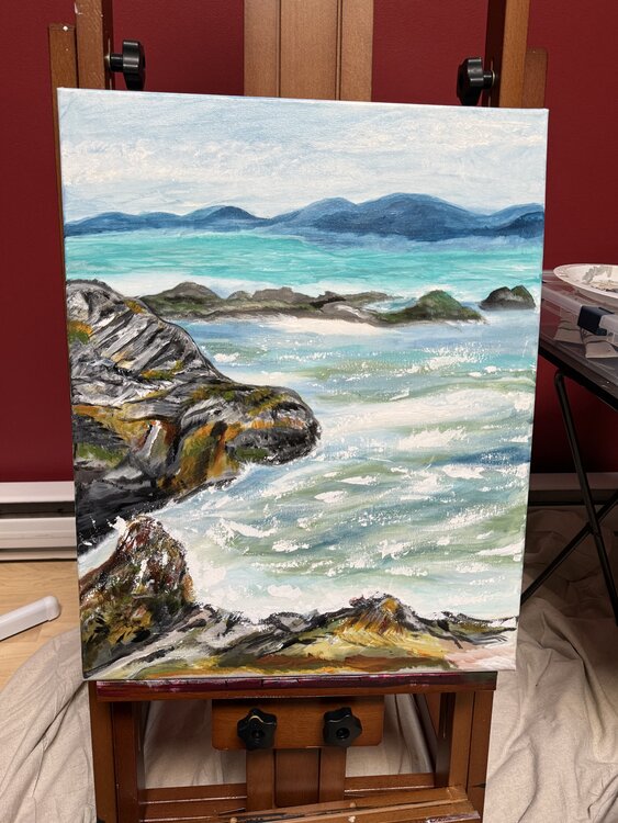 The crashing waves against the rugged rocks evoke a sense of calm and resilience, while the distant blue mountains invite dreams of endless horizons. This artwork breathes the fresh, invigorating energy of the ocean, ready to bring a soothing yet invigorating vibe to any space. Created with a reference photo taken in Eastern Canada and using a plethora of blue hues, in my own style.