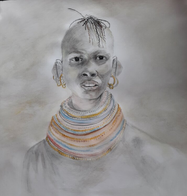 In my artwork I capture the essence of human expression and dignity. Using graphite and chalk on paper I bring out the powerful aura and fascinating culture. This work celebrates tradition and timeless beauty that is meant to take the viewer into a world of reflection and admiration. (The image is slightly larger and can be cropped)