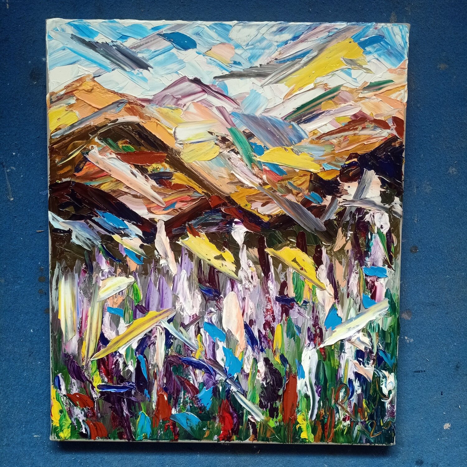 Painted entirely with a palette knife, the composition is built through bold oil impasto and sweeping directional strokes. The upper part of the canvas suggests hills or mountains illuminated by early light, while the lower field becomes a vibrant space of vertical rhythms and chromatic growth. Yellows, blues, violets, whites, and earthy… tones interact with great immediacy, evoking the freshness and movement of morning as an emotional experience rather than a literal scene.