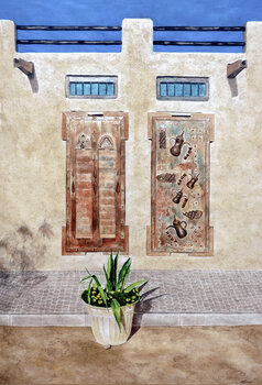 This watercolour painting depicts the historic Sheikh Saeed Palace in Dubai, an iconic heritage structure built from clay and wood. The palace’s hand‑carved doors — each rich with traditional motifs — are the focal point of the piece. When sunlight falls across the façade, the building takes on a magical, almost timeless glow, which I’ve tried to capture in the work.