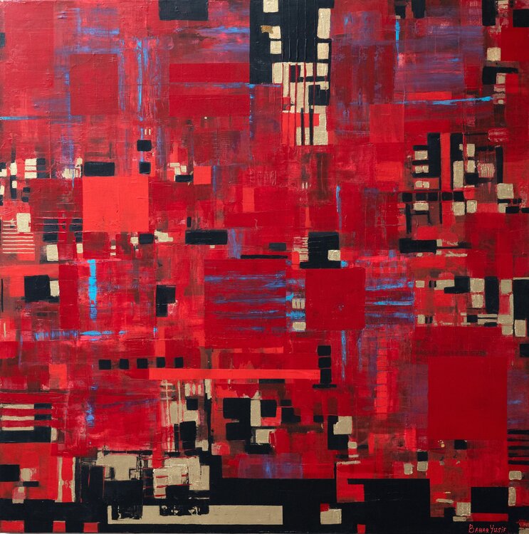 In this piece, I explored the raw emotions of passion and conflict, using a vibrant palette dominated by crimson and accentuated with hints of gold leaf. The interplay of colors and structured chaos draw from abstract, cubism, and expressionism, aiming to evoke a sense of dynamic tension and resolution. Each stroke and splash of paint is a testament to the fiery dialogues that define human relationships and personal battles. This artwork isn't just… meant for viewing; it’s a conversation starter, designed to bring energy and a bold statement into any space.