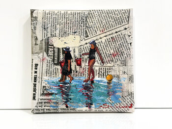 The painting is created with acrylic on stretched canvas, which was first covered with fragments of newspaper. This textured base introduces an underlying layer of everyday life, contrasting… with the fluidity of the scene. The expressive brushstrokes and reflections create a sense of rhythm, while the composition remains open and airy.