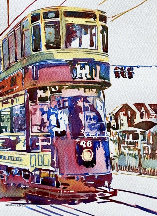 In this vibrant watercolor, I poured my love for urban life and motion into every brushstroke. The expressionistic colors capture the energy and nostalgia of a passing tram, blending fine art with raw emotion. Hang this piece to feel the pulse of Blackpool in the north of England and the timeless rhythm of its vintage tram rides, bringing dynamic movement and heartfelt warmth into your space.