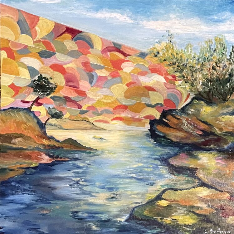 In this work, oil allows me to mix intense emotions with the softness of nature (a haven of peace). I try to capture the dynamics and impulse of light through a living landscape, one that I sometimes encounter and transform according to my emotions. It is a sanctuary of peace, but also a vibrant painting that evokes reflection and sensitivity. This painting is an explosion of color (therefore joy for me) and a soothing energy.