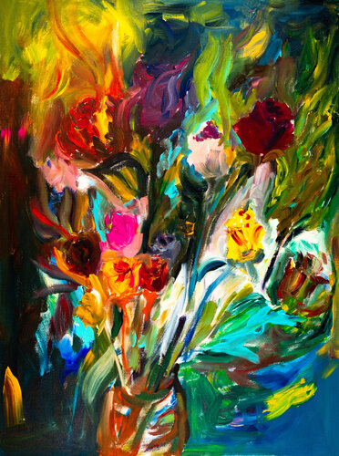 Fire Flowers is an emotional work. There are so many things in life that are either overwhelming or bittersweet. Is it fire or water, smoke or tears? I made this work by studying a dead bouquet that I had left to dry. I stood over it, looking at it on the floor in a vase, looking at myself. I brought it back to life, seeing all the tragedy and beauty in it.