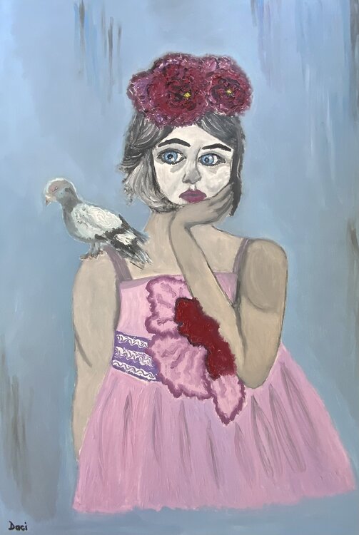 In this painting, I poured my heart into capturing a fragile balance between innocence and contemplation. The delicate girl, adorned with symbolic flowers and a gentle dove, embodies purity and quiet strength. The soft oil textures combined with structure paste and muted tones bring an intimate, dreamlike energy that will fill any space with a peaceful, reflective presence. This piece invites you to pause and feel the gentle pulse of untouched wonder.