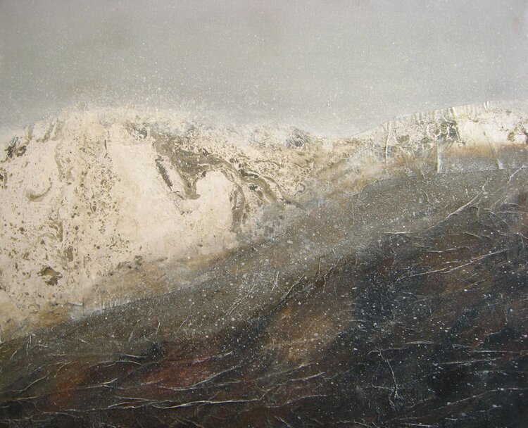 In this work, I sought to capture the raw and untamed essence of the mountain. Using a rich mix of acrylic, oil, collage, sand and dead plaster, I explored textures and contrasts to evoke the power and majesty of natural elements. The semi-abstract style allows each eye to get lost in the subtle details. This piece will add a dimension of contemplation and indomitable inspiration to any living space.