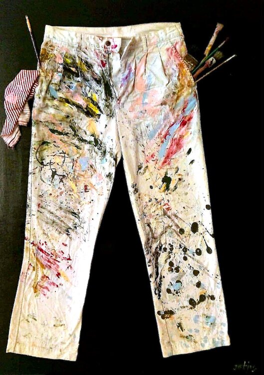 I am celebrating my reclaimed pants for being with me throughout so many works... blending acrylic, oil, and collage to capture the essence of creation and spontaneity. The paintbrushes tucked in symbolize the artist’s journey, the mess and beauty of realism intertwined with symbolic expression. This piece brings vibrant energy and raw authenticity, inviting the viewer to celebrate the chaos and freedom inherent in art itself. It’s a tribute to the… hands that make and the stories they tell.