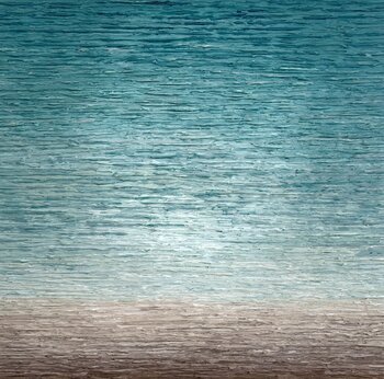 This mesmerizing artwork captures the serene beauty of a vast horizon where sky meets sea. The canvas is divided into three horizontal bands, seamlessly blending into one another. The top is dominated by a rich, textured turquoise that gradually fades into a lighter blue, evoking the endless possibilities of an expansive sky. Below, the earthy tones of the lower band suggest a tranquil shoreline, inviting contemplation and calm. The artist's masterful… use of texture creates depth, as if each brushstroke were a wave in gentle motion. The subtle gradient and layered composition exude a sense of harmony, portraying nature's tranquility with precision. This piece uniquely balances abstraction with naturalism, inviting viewers to lose themselves in its immersive landscape.