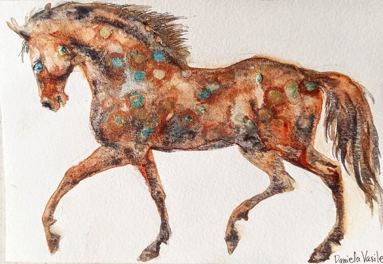 In this spirited watercolor, I've captured the essence of movement and freedom. Each brushstroke embodies the wild grace of a noble creature, with earthy bronze hues and golden topaz splashes of color that hint at the untamed soul. The fluid balance between realism and abstraction invites onlookers into a dance of imagination. Bringing this piece into your space will infuse it with a sense of life's unrestrained beauty.